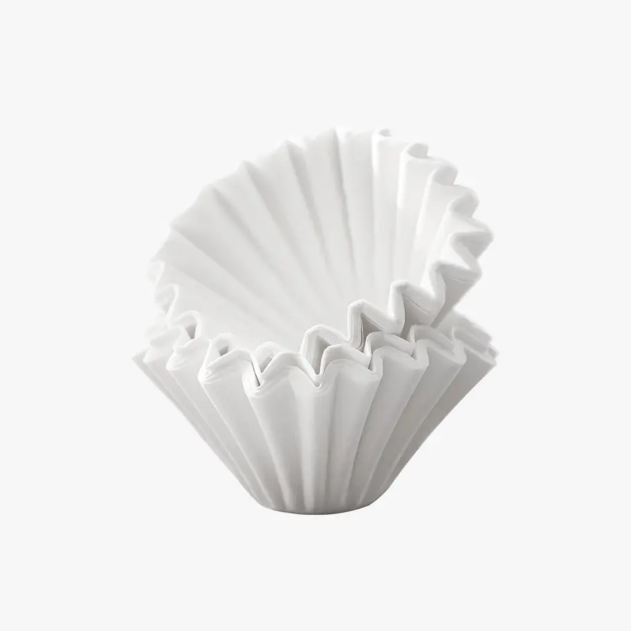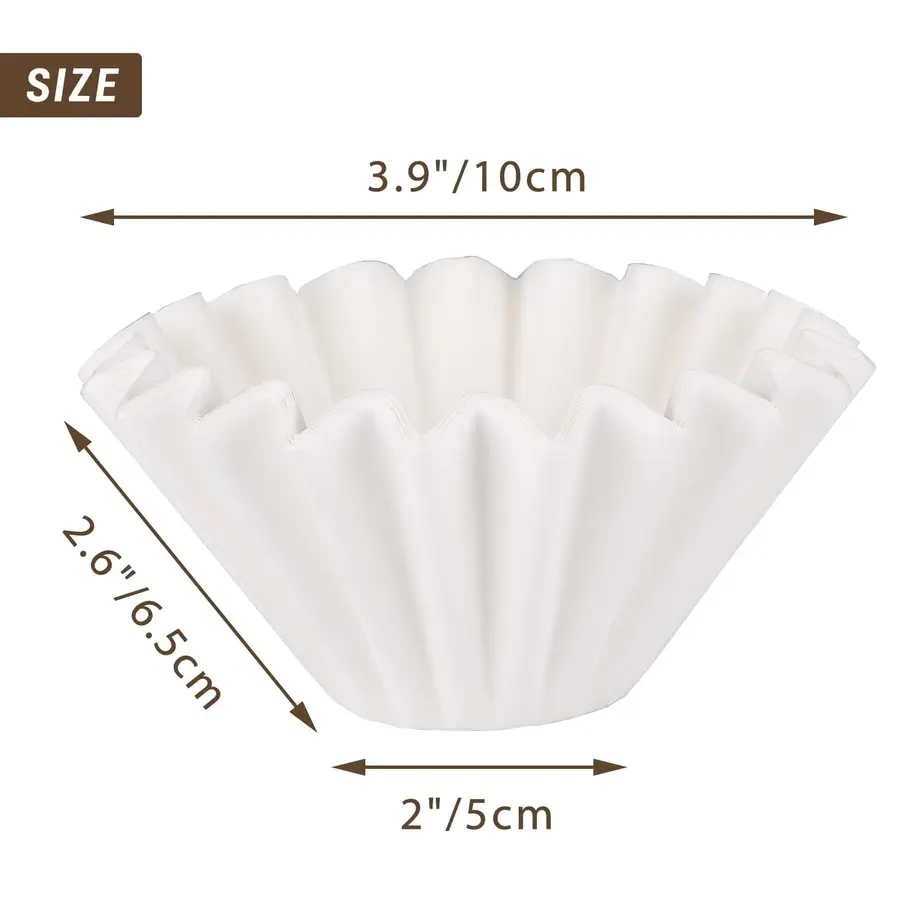 Pack of 50 disposable basket filters fits most flat-bottom drip coffee makers, single-serve brewers, and many pour-over drippers. Reliable structure with wavy walls prevents collapse for stable, smooth brewing.